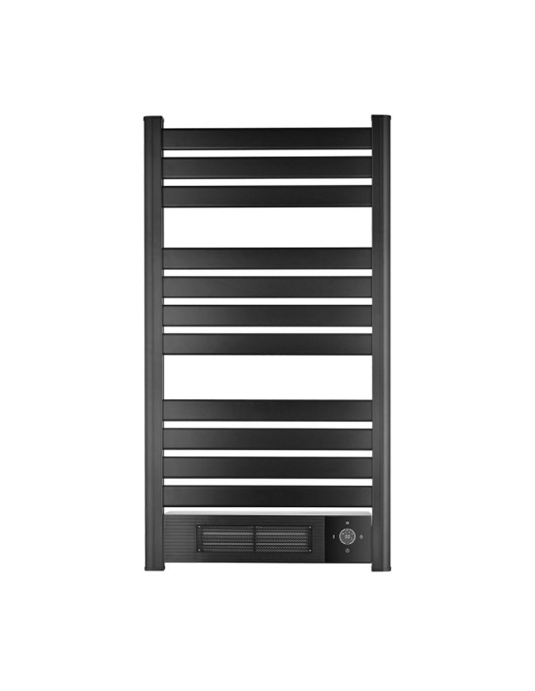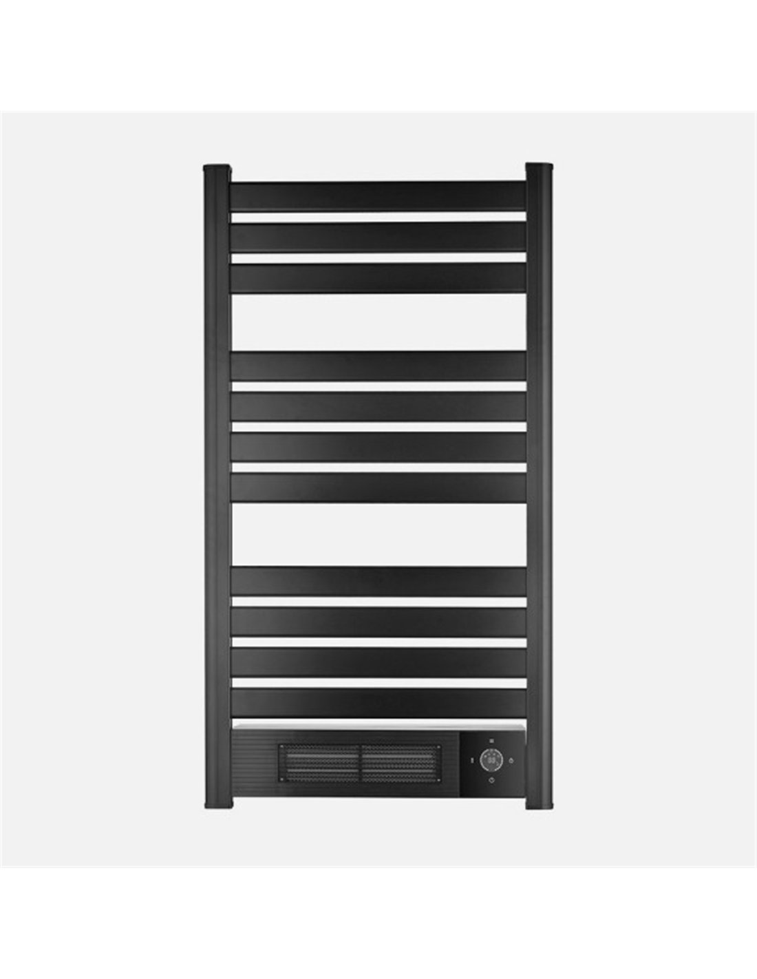 Toallero eléctrico de aluminio con calefacción PTC cerámico de la serie VELEZ en color NEGRO. Con funcionamiento SECO sin fluidos, realizado con elemento calefactor cerámico y aluminio, con salida de aite caliente y ventilador integrado para distribuir y templar rápidamente. Equipado con 2000 vatios de potencia máxima repartidos en sus 11 elementos calefactores, que permiten calentar y secar eficazmente y con bajo consumo cualquier estancia. Incluye Kit de instalación con todos los elementos necesarios para anclarlo a la pared, preparado para baños con un IPX4, también es apto para instalar en lavaderos, garajes y cualquier estancia donde desee templar al mismo tiempo que seca las toallas húmedas y las mantiene calientes. Con dos modos seleccionables de funcionamiento: SECADO (500w) y SECADO+CALEFACCIÓN (2000w) para elegir, también puede programar su apagado automático de 1 a 24 horas. Desde su pantalla LED nos informa de la temperatura a la que se encuentra la estancia, con MANDO A DISTANCIA, fácil de usar. Viene con un sistema de protección sobrecalentamiento que apaga el toallero si sobrepasa una alta temperatura. Tiene unas dimensiones de 102x55,5x3,8 centímetros. Disponibles en esta serie con acabados en negro o en blanco para elegir el que mejor le venga a su decoración.