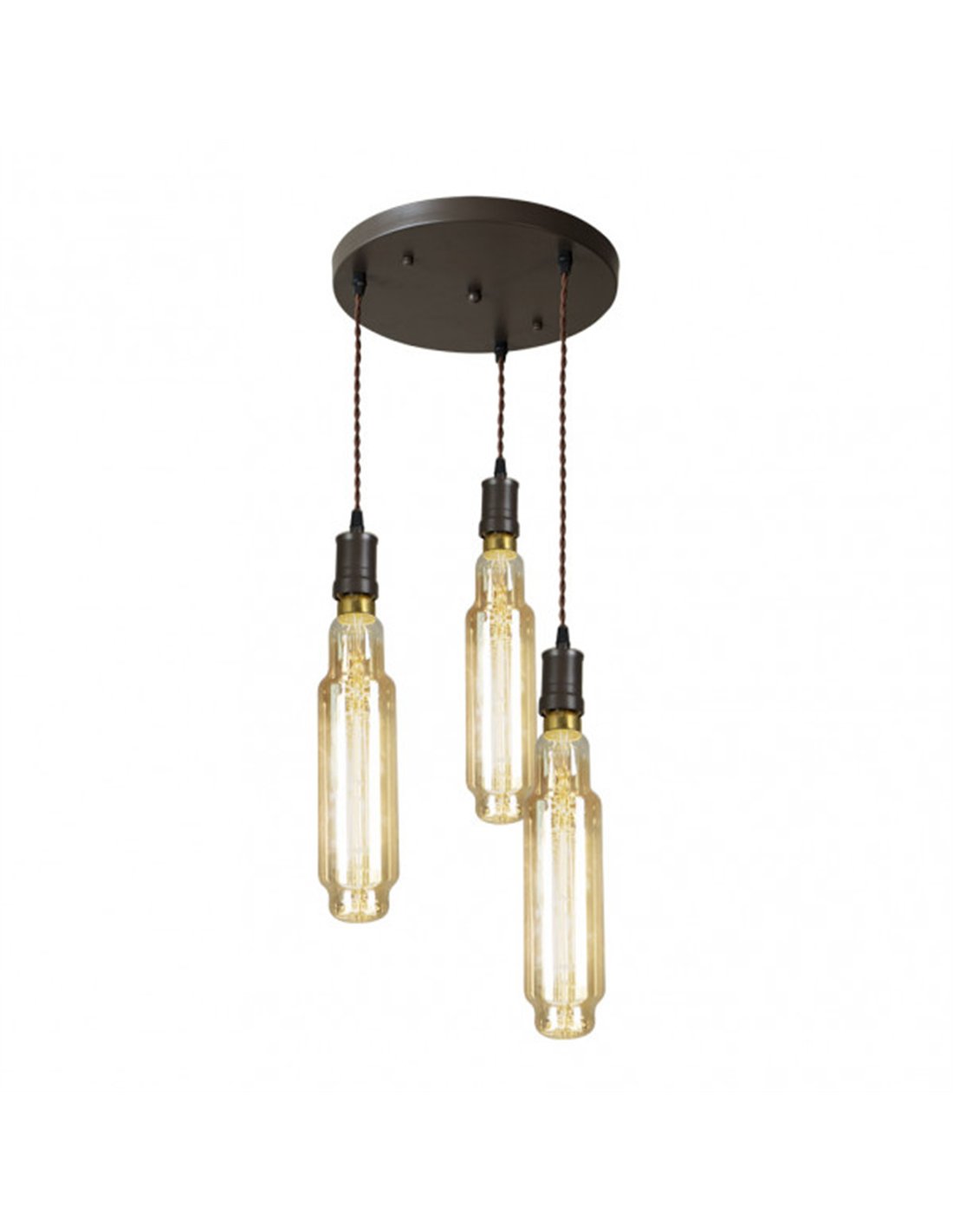 Colgante de tres luces de la serie ELIO de color MARRON/AMBAR. Realizado en metal, destaca por el diseño moderno y diferente de sus bombillas LED VINTAGE DECO DE GRAN TAMAÑO con filamentos, con una potencia de 24 vatios, 2550 lúmenes y luz cálida, 3000K, con tres portalámparas en E27, lo que hace posible cambiar su bombilla cambiando así la estética y luz de la lámpara. Bombilla DECORATIVA VINTAGE incluida. De diseño original ideal para dormitorios, salones y comedores e incluso para zonas de trabajo y rincones especiales en casas decoradas con estilo moderno, encajando también muy bien en ambientes decorados con los nuevos estilos Industrial y Vintage. Sus dimensiones, regulables en altura, son de 53<,135x30x30 centímetros. Disponible a juego también en esta serie, las lámparas de tres colgantes dispuestos de forma lineal y el colgante de una luz.
