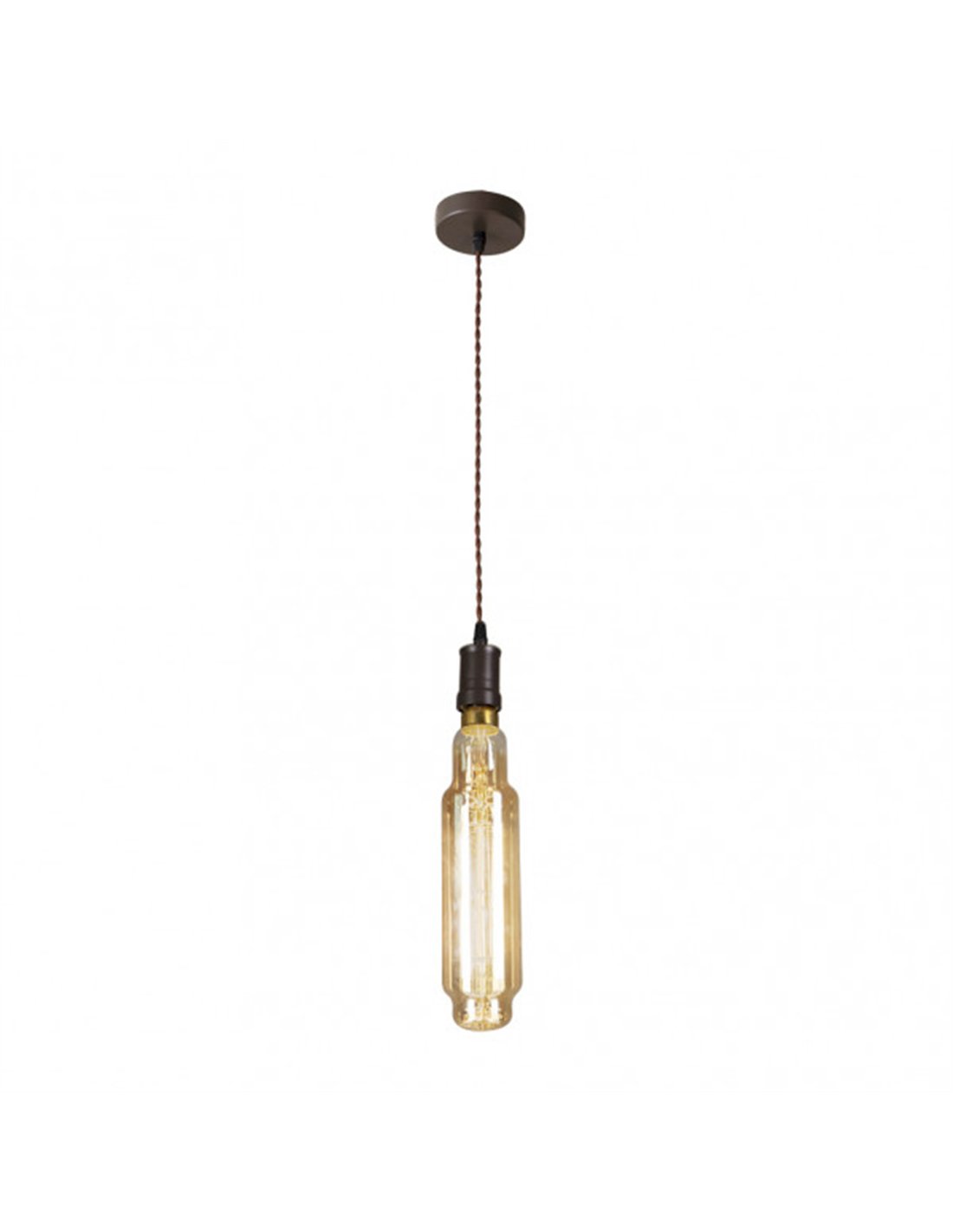 Colgante de una luz de la serie ELIO de color MARRON/AMBAR. Realizado en metal, destaca por el diseño moderno y diferente de su bombilla LED VINTAGE DECO DE GRAN TAMAÑO con filamentos, con una potencia de 8 vatios, 850 lúmenes y luz cálida, 3000K, con un portalámparas en E27, lo que hace posible cambiar su bombilla cambiando así la estética y luz de la lámpara. Bombilla DECORATIVA VINTAGE incluida. De diseño original ideal para dormitorios y salas de estar e incluso para zonas de trabajo y rincones especiales en casas decoradas con estilo moderno, encajando también muy bien en ambientes decorados con los nuevos estilos Industrial y Vintage. Sus dimensiones, regulables en altura, son de 58<,106x12x12 centímetros. Disponible a juego también en esta serie, las lámparas de tres colgantes dispuestos de forma lineal o circular.