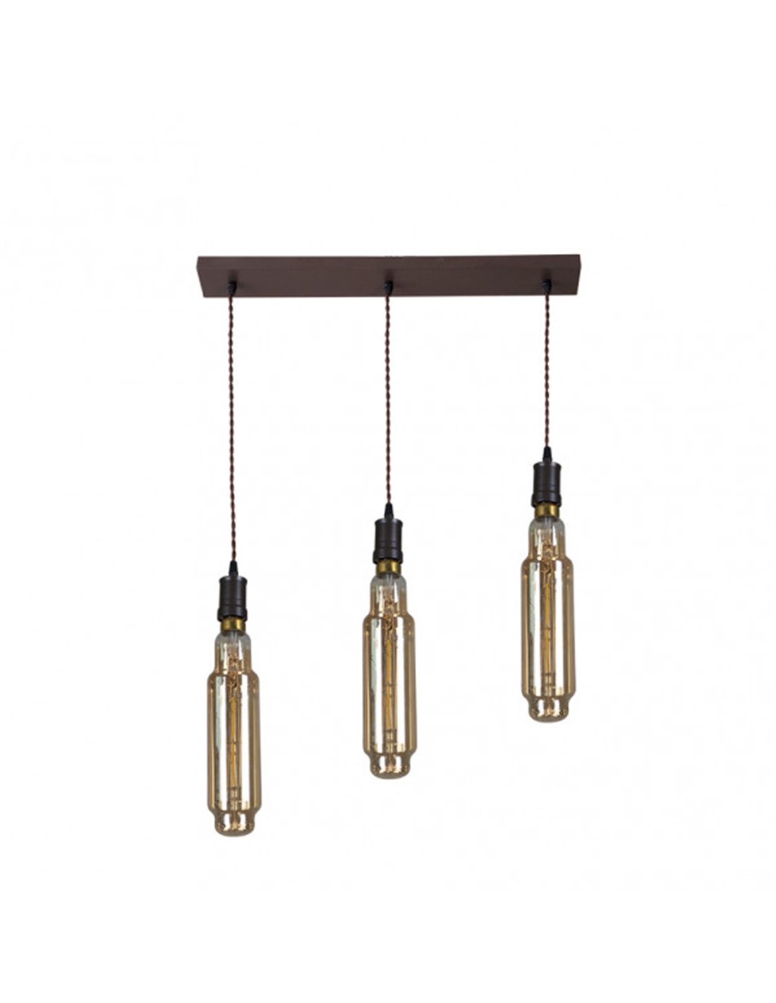 Colgante de tres luces de la serie ELIO de color MARRON/AMBAR. Realizado en metal, destaca por el diseño moderno y diferente de sus bombillas LED VINTAGE DECO DE GRAN TAMAÑO con filamentos, con una potencia de 24 vatios, 2550 lúmenes y luz cálida, 3000K, con tres portalámparas en E27, lo que hace posible cambiar su bombilla cambiando así la estética y luz de la lámpara. Bombilla DECORATIVA VINTAGE incluida. De diseño original ideal para dormitorios, salones y comedores e incluso para zonas de trabajo y rincones especiales en casas decoradas con estilo moderno, encajando también muy bien en ambientes decorados con los nuevos estilos Industrial y Vintage. Sus dimensiones, regulables en altura, son de 60<,130x64x12 centímetros. Disponible a juego también en esta serie, las lámparas de tres colgantes dispuestos de forma circular y el colgante de una luz.