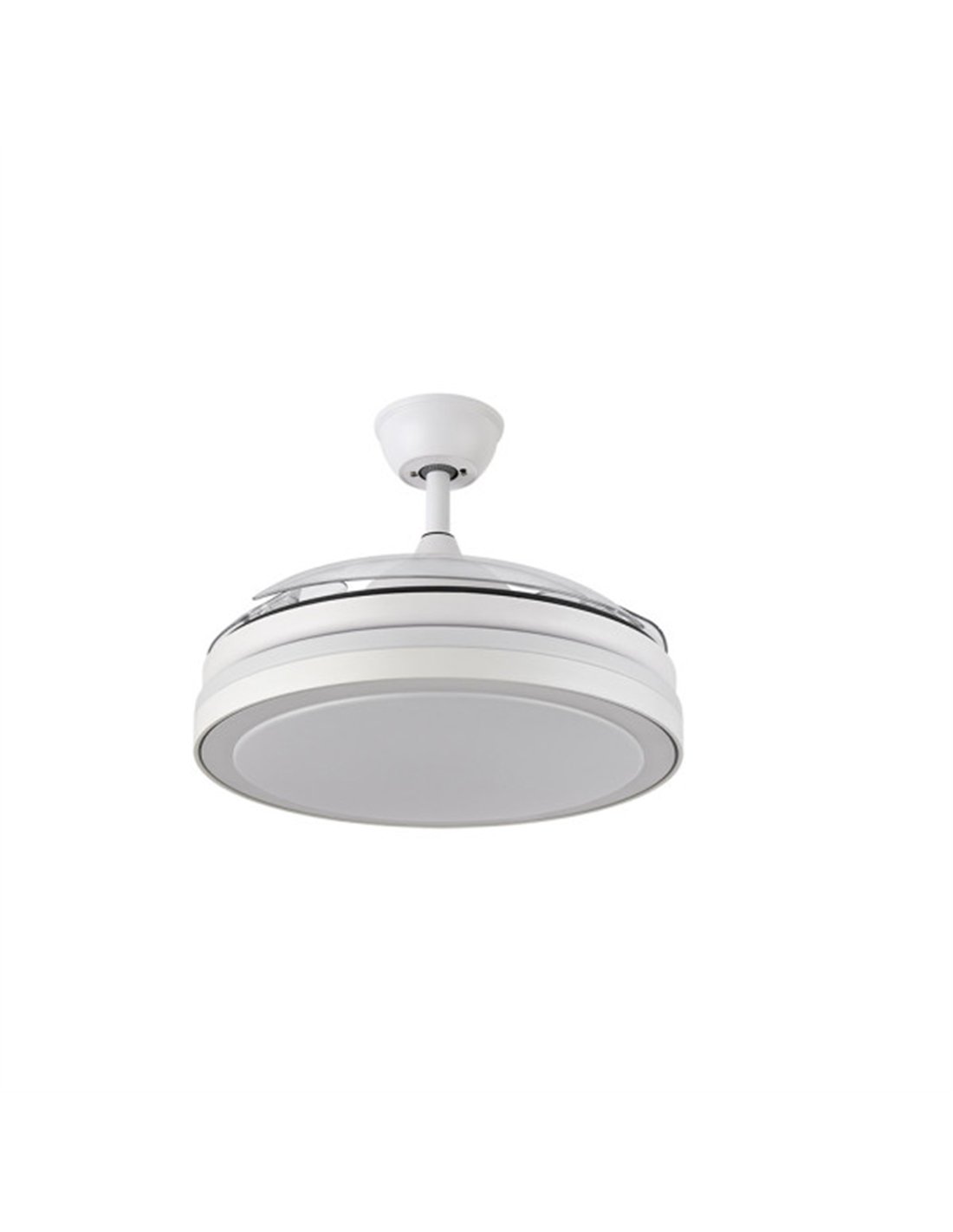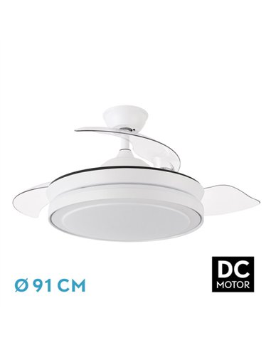 Ventilador DC de la serie ESPARTA MINI realizado en metal, policarbonato y ABS, en color BLANCO con tres aspas DESPLEGABLES de ABS transparente muy resistentes. Tiene seis velocidades ajustables. Tecnología LED integrada con una potencia de 59W, con 3 TEMPERATURAS SELECCIONABLES DE LUZ (3000-4000-6000K) y 6980 lúmenes. Control de aire verano o invierno. Su medida es de 32/47X40 centímetros con las aspas plegadas y de 32/47X91 centímetros con las aspas desplegadas. Incluye dos tijas de 10 y 25 centímetros, para colocar a distintas alturas. Mando a distancia INCLUIDO con MEMORIA DE COLOR incorporada y TEMPORIZADOR 1/4 H. Modelo disponible con un diámetro de 132, 107, 91 Y 72 centímetros y todos en blanco, negro o plata.