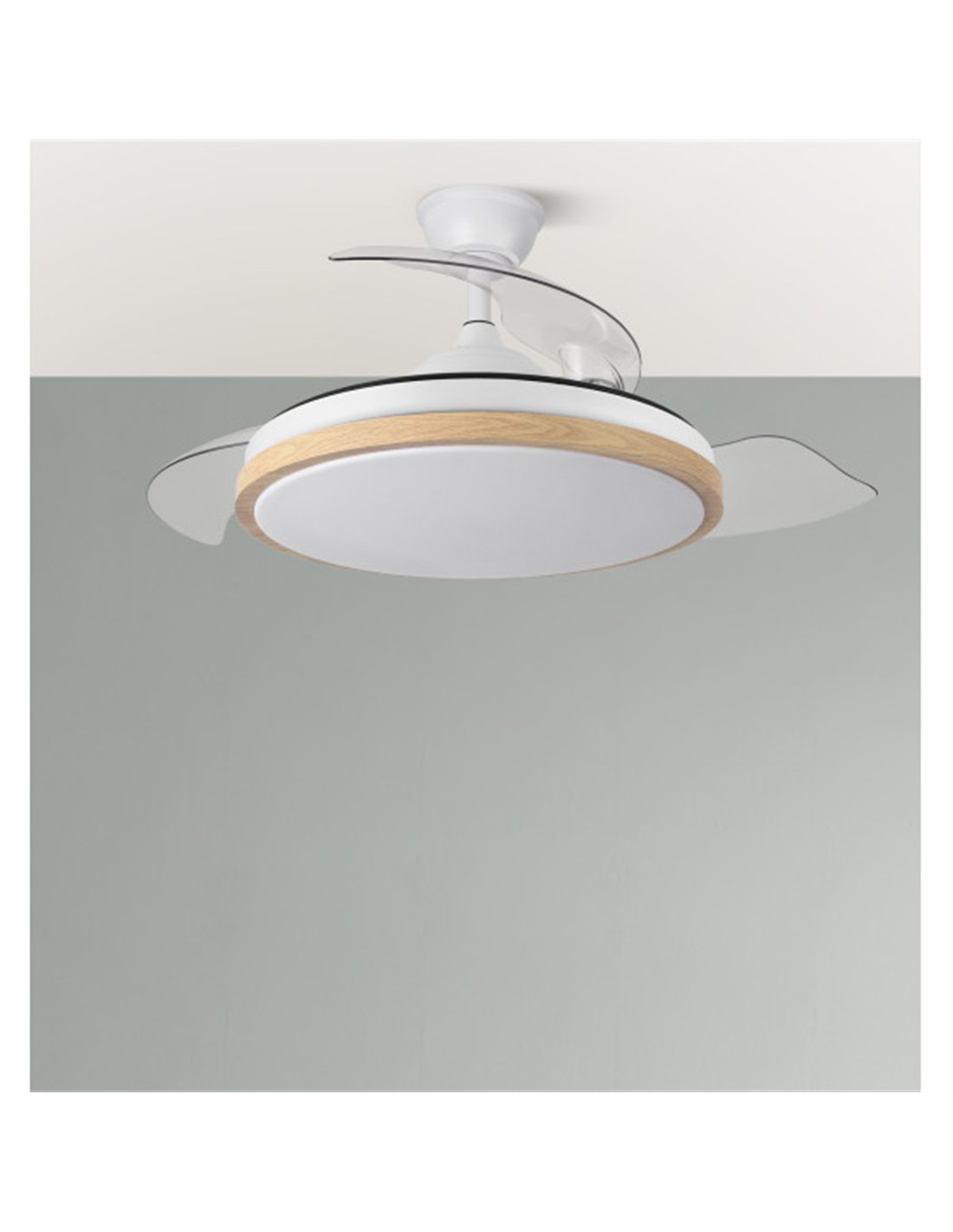 Ventilador DC de la serie EVROS realizado en metal, policarbonato y ABS, en color BLANCO/HAYA con tres aspas DESPLEGABLES de ABS transparente muy resistentes. Tiene seis velocidades ajustables. Tecnología LED integrada con una potencia de 59W, con 3 TEMPERATURAS SELECCIONABLES DE LUZ (3000-4000-6000K) y 6980 lúmenes. Control de aire verano o invierno. Su medida es de 32/47X50 centímetros con las aspas plegadas y de 32/47X107 centímetros con las aspas desplegadas. Incluye dos tijas de 10 y 25 centímetros, para colocar a distintas alturas. Mando a distancia INCLUIDO, REGULABLE EN INTENSIDAD, con MEMORIA DE COLOR incorporada y TEMPORIZADOR 2/4 H. Disponible en esta serie en color blanco/haya y negro/haya y en dos tamaños diferentes.