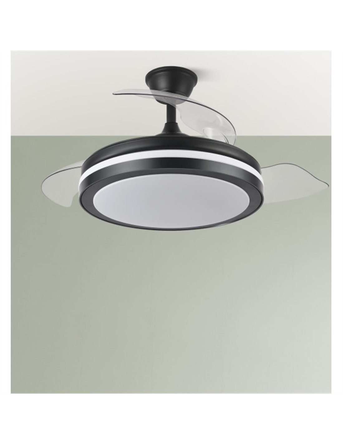 Ventilador DC de la serie ESPARTA PLUS realizado en metal, policarbonato y ABS, en color NEGRO con tres aspas DESPLEGABLES de ABS transparente muy resistentes. Tiene seis velocidades ajustables. Tecnología LED integrada con una potencia de 59W, con 3 TEMPERATURAS SELECCIONABLES DE LUZ (3000-4000-6000K) y 6980 lúmenes. Control de aire verano o invierno. Su medida es de 32/47X50 centímetros con las aspas plegadas y de 32/47X107 centímetros con las aspas desplegadas. Incluye dos tijas de 10 y 25 centímetros, para colocar a distintas alturas. Mando a distancia INCLUIDO con MEMORIA DE COLOR incorporada y TEMPORIZADOR 1/4 H. Modelo disponible con un diámetro de 132,107,91 Y 72 centímetros y todos en blanco, negro o plata.