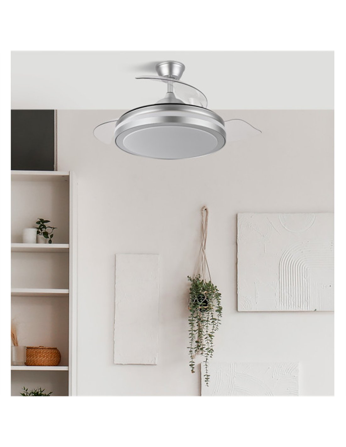 Ventilador DC de la serie ESPARTA PLUS realizado en metal, policarbonato y ABS, en color PLATA con tres aspas DESPLEGABLES de ABS transparente muy resistentes. Tiene seis velocidades ajustables. Tecnología LED integrada con una potencia de 59W, con 3 TEMPERATURAS SELECCIONABLES DE LUZ (3000-4000-6000K) y 6980 lúmenes. Control de aire verano o invierno. Su medida es de 32/47X50 centímetros con las aspas plegadas y de 32/47X107 centímetros con las aspas desplegadas. Incluye dos tijas de 10 y 25 centímetros, para colocar a distintas alturas. Mando a distancia INCLUIDO con MEMORIA DE COLOR incorporada y TEMPORIZADOR 1/4 H. Modelo disponible con un diámetro de 132,107,91 Y 72 centímetros y todos en blanco, negro o plata.