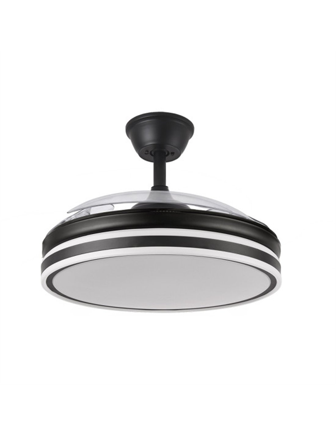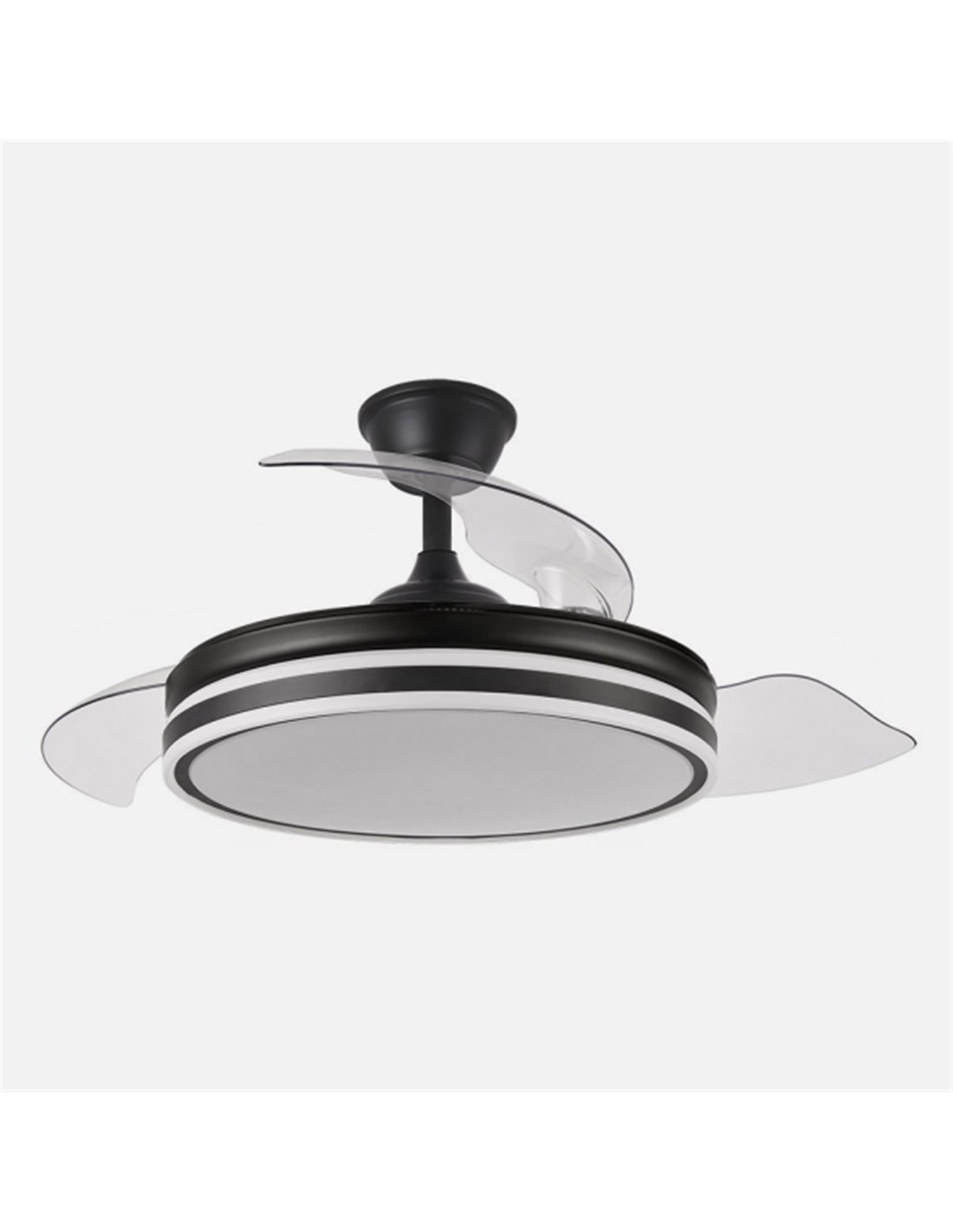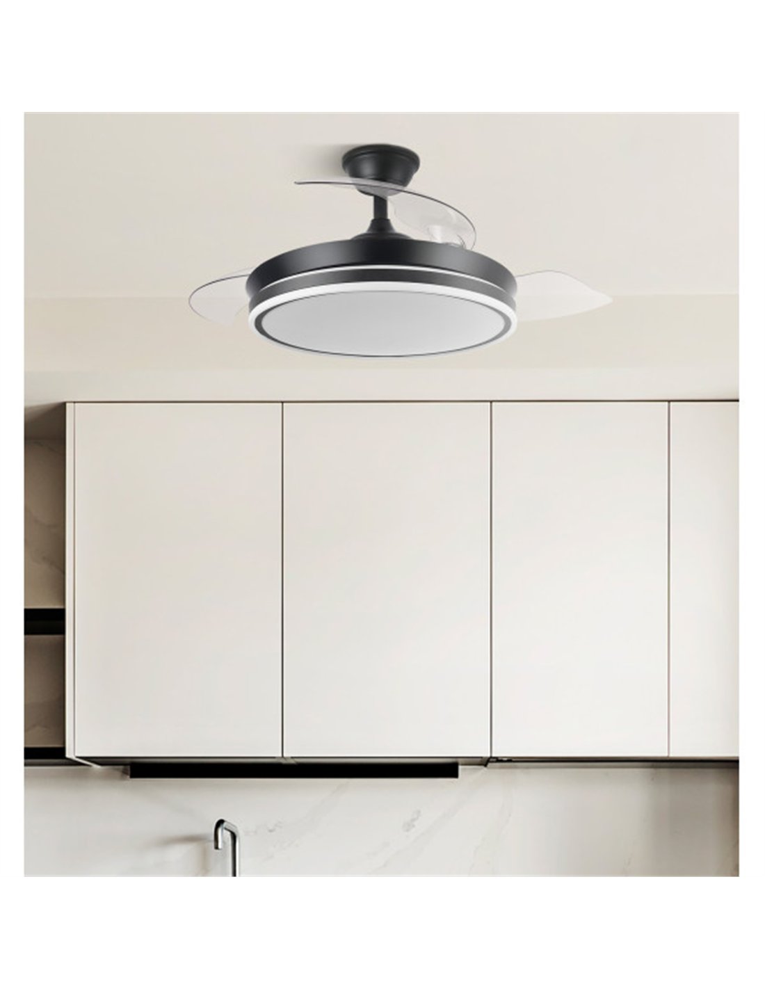 Ventilador BAYOMO realizado en metal y policarbonato, en color NEGRO con cuatro aspas DESPLEGABLES de ABS transparente muy resistentes. Motor DC. Tiene seis velocidades ajustables. Tecnología LED integrada con una potencia de 59W, con 3 TEMPERATURAS DE LUZ (3000-4000-6000K) y 6980 lúmenes. Control de aire verano o invierno. Su medida es de 34,5/42X50X50 centímetros con las aspas plegadas y de 34,5/42X107X107 centímetros con las aspas desplegadas, con dos medidas de tija para instalarlo a diferentes alturas. Mando a distancia INCLUIDO, REGULABLE EN INTENSIDAD, con MEMORIA DE COLOR incorporada y TEMPORIZADOR 2/4 H. Modelo disponible en color Níquel, Cuero, Blanco y en color Negro.