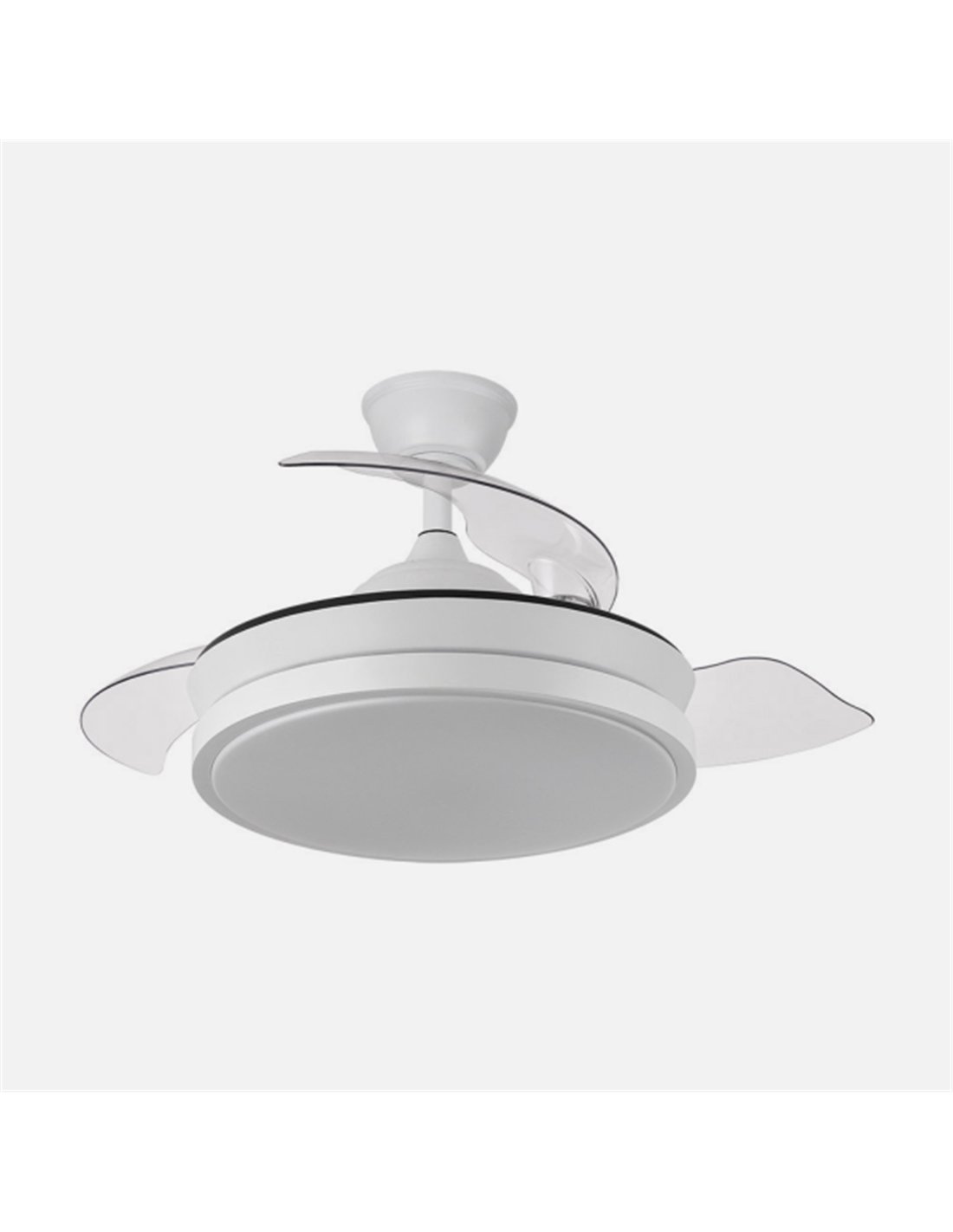 Ventilador DC serie ESCORPION MINI realizado en metal, ABS y policarbonato, en color BLANCO con tres aspas DESPLEGABLES en ABS muy resistentes. Tiene seis velocidades ajustables. Motor DC. Tecnología LED integrada con una potencia de 59W, con 3 TEMPERATURAS SELECCIONABLES DE LUZ (3000-4000-6000K), luz cálida, natural y blanco frío, y 6980 lúmenes. Control de aire verano o invierno. Su medida es de 34,5/42X40 centímetros con las aspas plegadas y de 34,5/42X91 centímetros con las aspas desplegadas. Incluye dos tijas de 12,5 y 20 centímetros. Con mando a distancia INCLUIDO, REGULABLE EN INTENSIDAD, MEMORIA DE COLOR incorporada y TEMPORIZADOR 2/4 H. Modelo disponible en dos tamaños.